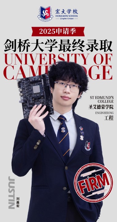祝贺青岛宏文学校Justin刘嘉宏同学以数学、进阶数学、物理、化学、计算机科学五科全A*+雅思8.0(单科不低于7.5)的优异成绩,获得英国剑桥大学Final Confirmation。